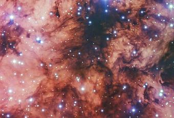 La radiación ultravioleta energética de las estrellas azules calientes en Gum 10 ioniza el gas en la nebulosa, despojando a los electrones de sus átomos. Cuando estos electrones se combinan de nuevo con los átomos, emiten luz a colores o longitudes de onda muy específicas. El tono rojo en esta imagen proviene del hidrógeno, el elemento más abundante en el Universo. Las áreas oscuras son densas nubes de polvo que bloquean parcialmente nuestra visión de los objetos detrás de ellas.