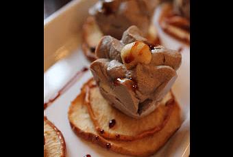 "Bombones de Higaditos de Ave Encebollados con Mantequilla al Jerez sobre Manzana Crujiente".