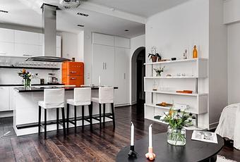 a pesar de tratarse de un apartamento pequeño, no se ha renunciado a poner una isla que más que parecer parte de la zona de trabajo de la cocina, parece un comedor integrado en el salón gracias al tablero de madera oscura y a los taburetes tapizados