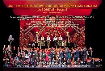 Fiorenza Cedolins (Mimì), Massimiliano Pisapia (Rodolfo), Beatriz Díaz (Musetta), Giorgio Caoduro (Marcello), Felipe Bou (Colline), Simone Del Savio (Schaunard), Jeroboám Tejera (Benoit / Alcindoro / un aduanero), Rubén Pérez (Parpignol / un vendedor), Stefano Ranzani (dirección musical), Mario Pontiggia (dirección artística), Claudio Martín (coreografía y diseño de vestuario). Orquesta Filarmónica de Gran Canaria, Coro de la Ópera de Las Palmas (dirección: Olga Santana Correa), Coro Infantil de la OFGC (dirección: Marcela Garrón Velarde).