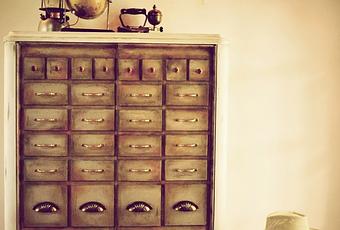 Otra serie de cajones llevan tiradores antiguos, y la puerta inferior unos largos y angostos cajones similares a los de un mueble de imprenta.
