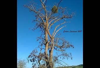 El motivo de esta entrada, es que hace unos días, antes de ir a la exposición de Illueca que ya comenté en la entrada "Zarpamos para Illueca", en un camino jalonado por acacias de tres espinas (Gleditsia triacanthos), vi una planta de muérdago. Y lo más curioso, es que en muchos kilómetros a la redonda, el muérdago que podemos contemplar es Viscum album austriacum que vive sobre pino carrasco (Pinus halepensis).Quedan muy lejos de este lugar las poblaciones de Viscum album album que viven sobre planifolios. Me surge una duda terrible. ¿Es este un primer pionero de la especie Viscum album album procedente de las poblaciones de Pirineo que ha viajado por casualidad hasta esta planta a la que puede parasitar o se trata de un ejemplar de Viscum album austriacum capaz de vivir sobre planifolios también?