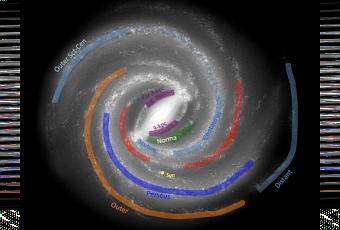 Un nuevo descubrimiento de una vasta sección de la espiral del brazo de formación de estrellas de la Vía Láctea, a unos 49.000 años luz del centro galáctico, muestra que nuestra galaxia posee una simetría rara y hermosa. El descubrimiento proporciona evidencias de una estructura a gran escala, que abarca 60 grados en el cielo, conteniendo gigantescas nubes de gas molecular muy lejos del centro galáctico, que poseen una cantidad equivalente de hidrógeno molecular a la de 50 mil soles.