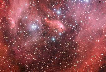 Una nueva imagen capturada por el telescopio MPG/ESO muestra la nebulosa Lambda Centauri, una nube de hidrógeno resplandeciente y estrellas recién nacidas en la constelación de Centaurus. La nebulosa, también conocida como IC 2944, es apodada la nebulosa del Pollo Corredor, por la forma similar a un pájaro que algunos ven en su región más brillante. En la nebulosa, ubicada a unos 6500 años luz de la Tierra, estrellas calientes recién nacidas, formadas en las nubes de hidrógeno, emiten un intenso brillo ultravioleta. Esta intensa radiación estimula a su vez a la nube de hidrógeno circundante, haciéndola brillar con un característico tono rojo. Este color rojo es típico de regiones de formación estelar, otro ejemplo famoso es la nebulosa de la Laguna.