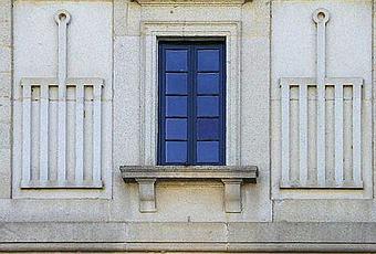 Y puesto que San Lorenzo murió martir, literalmente asado en una parrilla, el emblema del Real Sitio será una parrilla, sí, como lo oyen: un utensilio que podemos ver representado en la bandera, el escudo, en numerosos lugares del edificio... y que incluso da forma a todo el complejo, tal y como puede verse en una perspectiva aérea.