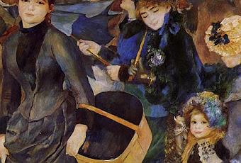 Pierre-Auguste Renoir (1841-1919)Los paraguas, 1881-1886Óleo sobre lienzo, 180,3 x 114,9 cmNational Gallery, LondresEsta importante pintura de Renoir fue realizada en dos etapas diferentes y ello se puede percibir a simple vista. La parte de la derecha de primer término, es decir, la que corresponde a la joven madre acompañada por sus dos hijas, está efectuada a la manera impresionista, mientras que el resto de la composición sigue una técnica derivada de Cézanne. Parece posible que Renoir hiciera hacia 1881-1882 y que interrumpiera su trabajo y no lo retomase hasta años después. Por este motivo las diferencias entre ambas zonas son tan acusadas.