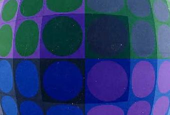 Sobre una cuadrícula se ordenan formas geométricas moradas, azules y verdes, que parecen flotar sobre el lienzo, distorsionándolo. Utilizando prespectivas opuestas y colores contrastantes, Vasarely ha logrado crear una ilusión óptica: cuando lo miramos, da la impresión de que las formas se mueven. Vasarely, fue uno de los pioneros del arte óptico, también conocido como Op Art, que evolucionó paralelamente al Pop Art en los años sesenta. El Op Art se basa en la idea de que el artista puede crear efectos ópticos que provoquen ilusiones en el espectador.