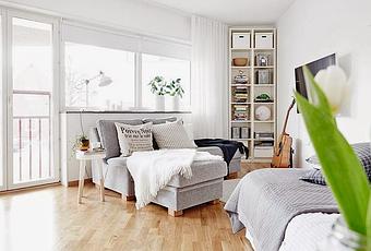 A la vista de la imágenes podríamos suponer que se trata de un amplio apartamento, pero nada más lejos de la realidad, se trata de un diminuto apartamento condicionado además por una forma triangular en su planta. Por un pequeño hall se acede al salón-cocina-comedor-dormitorio, es decir todo el espacio esta unido, exceptuando el aseo. El mobiliario y los colores acertadamente elegidos hacen de este espacio un lugar ideal para vivir con sensación de amplitud, pese a sus escasas dimensiones. Quiero poner énfasis en la mesilla realizada con cajas de madera y las sillas del comedor que me tienen francamente cautivada.