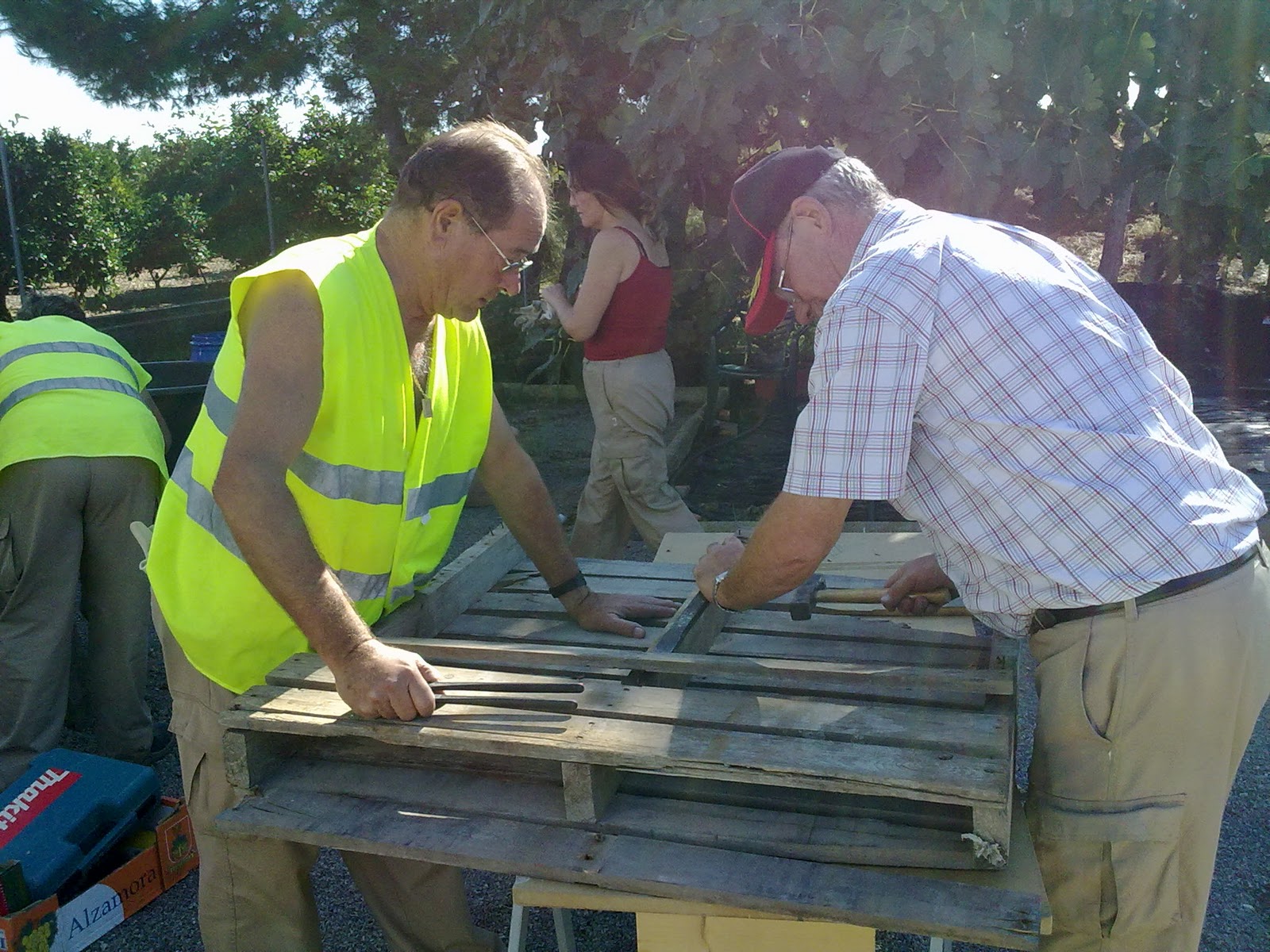 La superficie del jardín la haríamos con marmolina blanca y corteza de pino (materiales sobrantes de trabajos realizados en el Taller de Empleo). Para separar estos dos materiales teníamos que hacer unos moldes. Decidimos reutilizar la madera de unos palets para hacer los mismos. Después serían pintados de blanco para que se confundiese con la marmolina del mismo color.