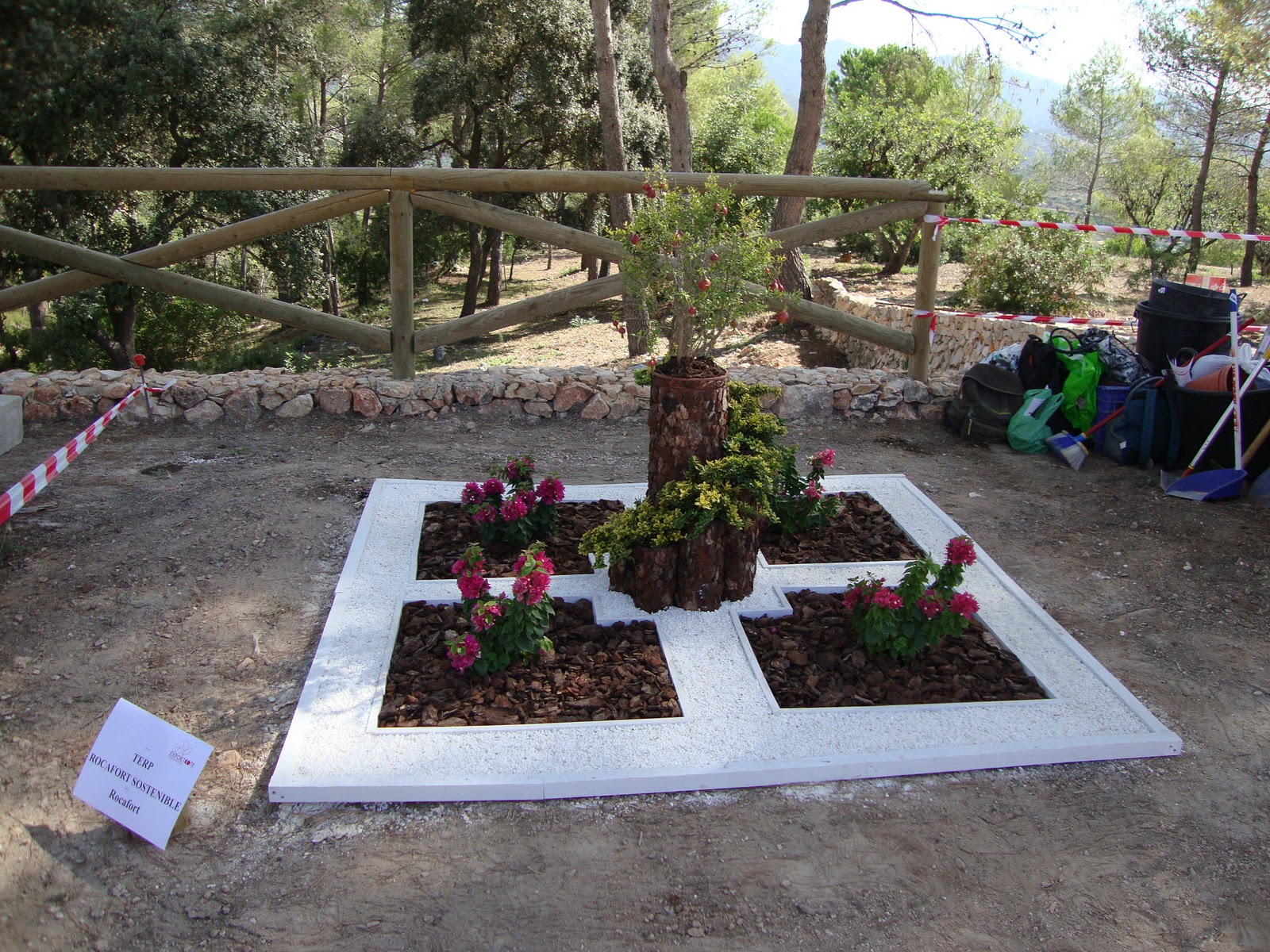 En los cuadrantes de corteza de pino se colocaron buganvillas. En el macetero se colocó evónimo micro en las tuberías pequeñas y en la grande un granado enano.