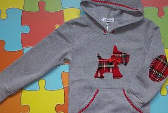 Unas coderas que le dan un toque chic a unas mangas sosas; unos piquillos para alegrar la capucha y el bolsillo canguro y un perrito scottie adornando en el delantero. El lacito es de quita y pon, para que al lavarla no se estropee.