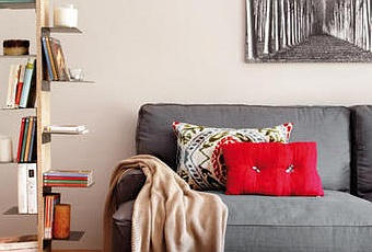 El suelo continuo de madera, unifica aún más los espacio y le aporta calidez. Las paredes con un suave color gris, elegante, un color que se repetirá en varios muebles, para alegrar este tono, que puede ser un poco triste lo han combinado con la vitalidad del rojo, creando un ambiente armónico y vivo.
