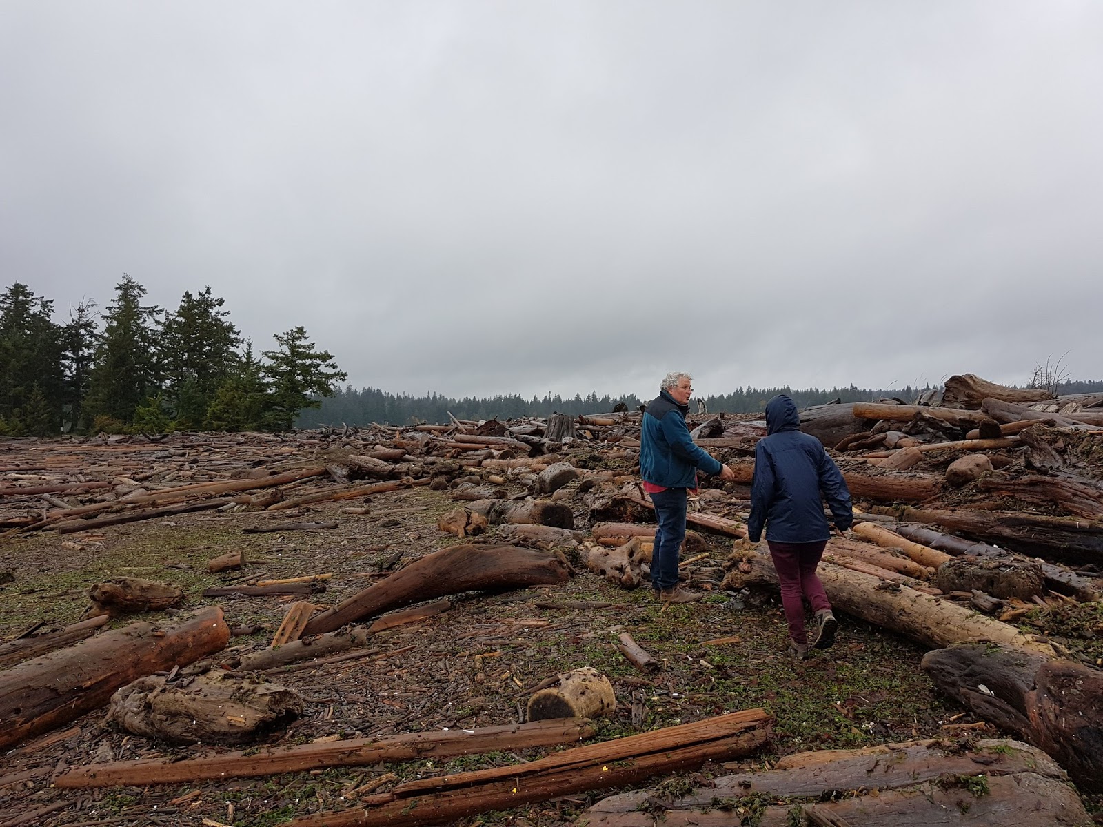We crossed the straight and in Quadra we met Jim, a 67 year old man with the energy of a teenager. The first thing we did with him was to go to a daycare centre and pick up a bucket of walnuts and 15 of sand. I also got some nashi pears which looked OK but turned out to be pretty much rotten, I didn’t know they’re still so firm when they’re brown inside. After, as it was on the way, we stopped in a couple of driftwood beaches to contemplate the ocean and scrutinize the shore looking for interesting shapes in the banked up logs and the rocks. Several local artists and craftsmen use these resources to do their work.
