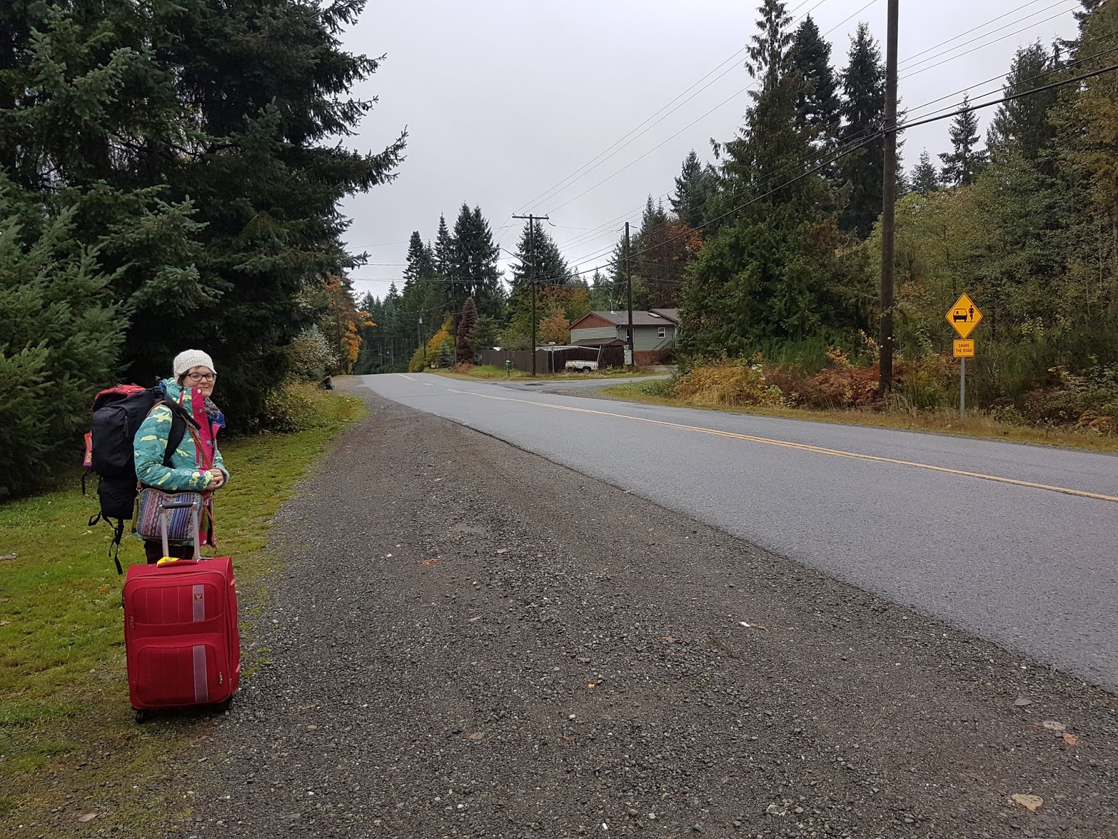 Para ir de Cumberland hasta Campbell River, que es desde donde zarpa el ferry (diez minutos de travesía) hacia Quadra Island, había dos opciones: ir en autocar por casi cuarenta dólares o hacer autoestop. Mientras mirábamos la web de los autocares tuvimos la suerte de que Judy andaba cerca cocinando y nos mencionó que podíamos conectar líneas de autobús municipal. De esta forma nos subimos al autobús número 2 que pasa tres veces al día por delante de su casa. Ese mismo autobús se transformó en el autobús 12 (sin ni siquiera tener que bajar de él o pagar otro billete) hasta llegar a la población de Oyster River. Una vez allí nos estaba esperando el autobús número 10 del término municipal de Campbell River que nos dejó a quinientos metros del muelle de los ferris.