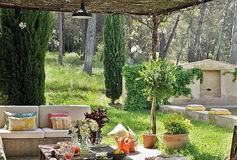 Este porche con techo de caña se renovó con cojines llenos de color, flores en ramos, macetas y complementos naturales. Si quieres crear un ambiente tan acogedor como este primero elige los colores. Sobre una base neutra apuesta por tonos estivales. Aquí: verde, salmón y amarillo. Combínalos en distintos tamaños para que tengan movimiento. Bastará con un par de cojines por asiento. Completa con detalles de fibras, zinc, faroles, cerámica... y flores.
