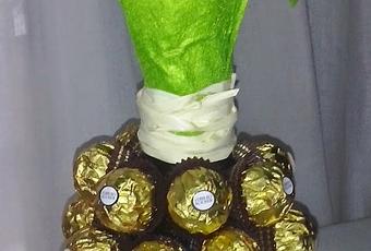 Es una forma diferente de presentar el champán o cava y los bombones. Simplemente vamos pegando los bombones al cuerpo de la botella hasta llegar a la parte alta, allí le pegué unas hojas hechas con fieltro y para tapar un poco la unión entre ambas partes, le puse un poco de rafia atada.