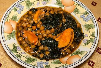 Cocemos los garbanzos (que doce horas antes habremos puesto a remojo) con el sofrito, una hoja de laurel y el caldo de cocción de los mejillones. Si éste no es suficiente líquido podemos completar con agua o con algún fumet de pescado u otro caldo de mejillones que tengamos en el congelador. Cada uno elegirá el método de cocción que prefiera: desde la olla exprés a la cazuela tradicional o la olla lenta. Desde que la descubrí, cocino casi todas las legumbres en olla lenta durante toda la noche( probablemente se obtengan los resultados más parecidos a las lentas cocciones antiguas).