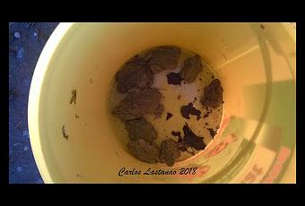Quedaron ahí, bajo los troncos donde se fueron introduciendo uno a uno. Este de la derecha se despidió de nosotros, pues se quedó ahí sin introducirse más. Eran las últimas horas de la tarde. Supongo que ya no estarán donde los dejamos, aunque no lo miramos para no molestarlos y no estamos seguros. Será un regalo para nosotros si un día encontramos un cordón de huevos de estos sapos ya sea en esta pequeña poza o en el futuro estanque que haremos...Las fotos son bastante bajas de resolución, ya que están hechas con el móvil en condiciones de poca luz...