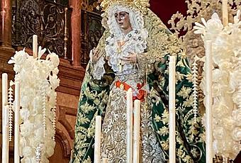 Llegar a visitar a la basílica de la Virgen de la Esperanza Macarena y encontrarse con poder acompañarla durante una misa supone uno de los momentos más gratos de esta Semana Santa. A su derecha, en un retablo del muro del evangelio, estaba situado Nuestro Padre Jesús de la Sentencia con su típica mirada de serena humildad