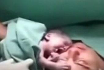 Un bebe recién nacido, la mama rendida por el corte cesareo, y la enfermera lo acerca a su lado. Pero sucede un imprevisto: el pequeño, evidentemente, muy agobiado por haberlo obligado a abandonar el vientre caliente donde se ha encontrado durante nueve meses, abraza a su madre sin ninguna intención de dejarla.