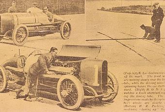 A bordo de un automóvil Sunbeam, construido para batir récord, logró alcanzar los 215,246 kilómetros por horaen la pista de Brooklands el piloto K. Lee Guinness. En las tres viejas fotografías se puede apreciar, en el extremo superior izquierdo, a Guinnessantes de lograr la marca récord; en el extremo superior derecho, se aprecia la línea de llegada y abajo el automóvil Sunbeam revisado por el mecánico de Guinness.