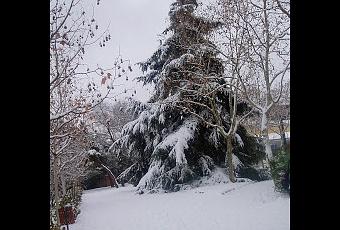 Las ramas arqueadas de los arbustos a ambos lados del paseo, parecían querer librarse de tan fría y pesada carga.