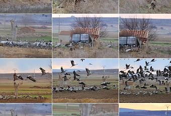El bando en plena huida. Con el fondo de los campos de Gallocanta, la escena se llena de movimiento. La gran bandada se dispersa en el aire, abandonando la zona en busca de un lugar más seguro.