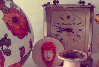 Palmatoria rosa - 7,00 euros.Reloj de latón ingles - 45,00 euros.Hucha de perro 50´s - 32,00 euros.
