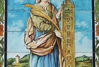 A un lado de la fachada de este último establecimiento podemos ver este retablo cerámico dedicado a una de nuestras patronas, Santa Justa (ya es raro verla sin la compañía de Santa Rufina), seguramente por la concordancia con el nombre del citado negocio.