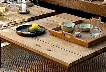 Un relajante rincón en el jardín para pasar las tardes de verano, donde se mezclan texturas rústicas, como el barro de las macetas, la madera recuperada de las mesas de centro y el cristal reciclado con el banco realizado con una traviesa de tren y la alfombra de yute. Un lugar ideal para relajarte y conversar