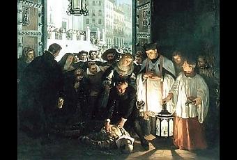 El Conde era un magnífico alanceador de toros y tuvo una brillante actuación delante de los Reyes. La Reina, emocionada por lo que acababa de ver exclamó “¡Qué bien pica el Conde!” a lo que Felipe IV respondió con una ya histórica frase. “Pica bien, pero pica muy alto”. Por lo visto el Rey no era ajeno ni ciego al rumor que prendía con fuerza por las calles, que el escritor, y alanceador, estaba enamorado de su esposa. Este personaje de novela no podía tener un final normal y en la madrugada del 21 de agosto de 1622, cuando su carroza bajaba por la Calle Mayor rumbo a San Ginés, un sicario se acercó a la ventanilla del Conde y le asestó una estocada que vació la vida de Villamediana. ¿Quién encargó y puso precio a su muerte?