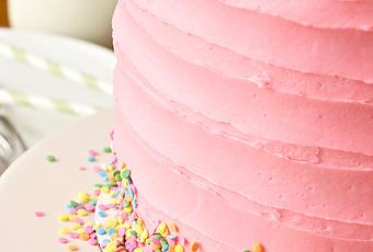 ¡Me encanta esta tarta taaaaaaaan rosa! Creo que es de esas cosas que desde el momento en que las ves te hacen sonreir. Es una enorme tarta de vainilla de tres pisos, bañada de rosa y con adornos multicolores. Es genial para el cumple de una princesita (yo conozco a una que hoy cumple 2 años y le mando un millón de besos a través de su mamá que seguro que lee este post :o) )