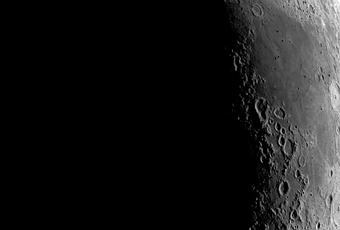 Esta fotografía de la Luna creciente muestra luz solar pasar casi rozando a través de la superficie fuertemente marcada, llenando sus cráteres de sombras. Esta es una región bastante lisa de la luna, pero en otras partes se encuentra altas montañas, con algunas cumbres que llegan a alrededor de 5000 metros. Cuando son iluminadas por el Sol, estas montañas proyectan largas sombras sobre la superficie lunar. Por allá por el año 1600, Galileo Galilei usaba estas largas sombras para determinar la altura de las cumbres. En los polos de la Luna (que no se ven en esta fotografía) algunos cráteres están permanentemente sombreados y las bases de algunos pueden no haber sido iluminadas por el Sol durante miles de millones de años. Los científicos habían sospechado por mucho tiempo que estas oscuras y permanentemente frías regiones de la Luna podían albergar hielo de agua, pero no fue hasta fines de 2009 que se halló evidencia para esto.