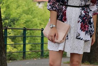 Este vestido blanco lo tengo desde hace ya unos cuantos años, y decidí probar a combinarlo con este kimono de flores en tonos granates y rosas, pero de una forma especial: añadiendo un cinturón. Además añadí el toque romántico con el bolso y el toque más chic con las sandalias. ¿Qué os parece?