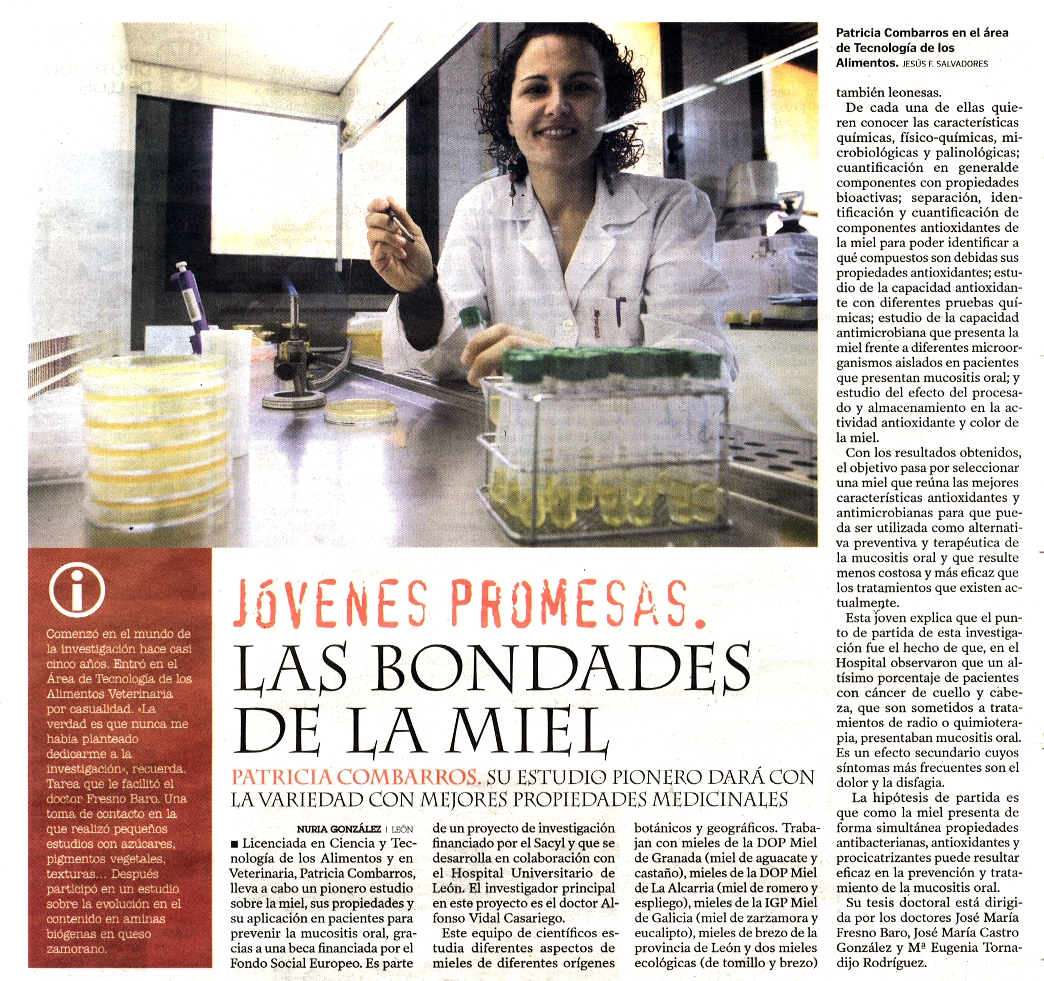 Y es justo desde este punto donde parte la investigación que Patricia Combarros está llevando a cabo en la Universidad de León , bajo la dirección del Dr. Vidal Casariego. La tesis de esta joven, y prometedora, investigadora parte de encontrar un método de tratamiento no agresivo para la mucositis oral, y para ello, está llevando a cabo el estudio de las posibilidades que la miel presenta para ser el tratamiento de esta afección.
