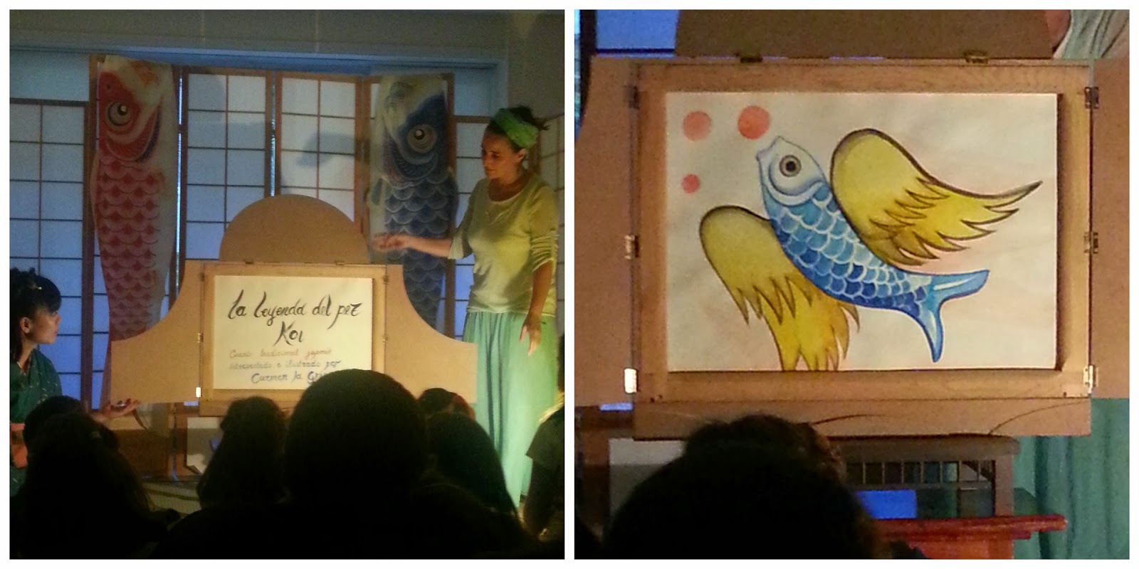 Pasamos a una sala en la que nos contaron "La Leyenda del pez Koi" me encantó la escenografia y la historia una historia preciosa con unas ilustraciones super bonitas. Después del cuento los peques pasaron a hacer un taller de manualidades en el que hicieron al pez Koi, la verdad es que lo pasaron estupendamente.