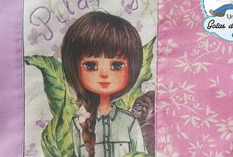 Me pidió que fuera con la tela de las grandes mujeres, y aunque me queda poca cantidad, para Pilar no fue obstáculo, y jugando con retales, ha quedado muy bien. Dian Fossey por un lado y por el otro Hipatia de Alejandría y la Tierra como protagonista. Su nombre bordado y mi gota como firma completan el conjunto.