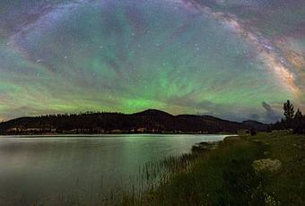 Esta fotografía, tomada el verano pasado cerca del Bryce Canyon (Utah, EEUU), muestra una resplandor verde intermitente que parece elevarse desde un lago en dirección al arco de la Vía Láctea. El insólito fenómeno es creado por las ondas de gravedad atmosféricas, es decir, las ondas de presión del aire que se alternan y que, a medida que el aire se adelgaza, aumentan de altitud, en este caso hasta unos 90 kilómetros. A diferencia de las auroras que se observan en latitudes altas y que son causadas por las colisiones con partículas cargadas energéticamente, la luminiscencia atmosférica es provocada por la quimioluminiscencia, es decir, la producción de luz en una reacción química. La luminiscencia atmosférica, que normalmente se observa cerca del horizonte, evita que el cielo nocturno sea completamente oscuro. Pasando el cursor por encima de la imagen aparecen unas anotaciones.