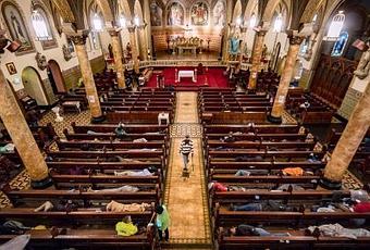 Alrededor de 70 personas sin hogar dormían silenciosamente en bancos en la parte posterior de la iglesia, ya que se les permite hacer todas las mañanas de lunes a viernes, con fieles rezando armoniosamente frente a ellos. La iglesia les da la bienvenida como parte del concepto católico de extender la mano amiga.