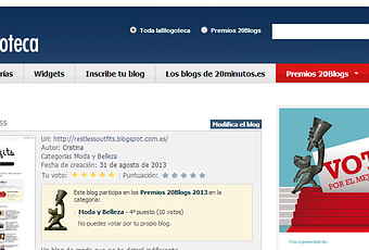 Hoy os quiero contar algo. Hace unas semanas decidí apuntarme a un concurso de blogs que lleva a cabo '20 minutos' para relanzar mi blog un poco y tener algo más de visibilidad. Pero para ello necesito que los pocos que somos aquí pongamos nuestro granito de arena. Tan solo tenéis que entrar en esta dirección: http://lablogoteca.20minutos.es/restless-outfits-42017/0/ y dadme un voto. Para ello os pedirá que os registréis. Podéis hacerlo vía mail o vía redes sociales, esta última es la vía más rápida.Por si hay alguna duda, que el año pasado las hubo, os debe salir algo como esto.