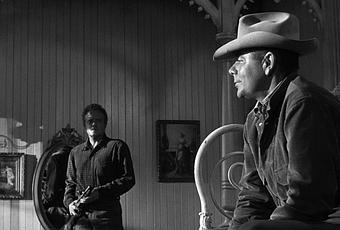 Las distintas líneas de suspense convergen debidamente en un último punto crucial, el clímax de la película. Allí se resuelven las distintas incógnitas planteadas a lo largo de la hora y media de metraje: el resultado de las hábiles e ingeniosas maniobras del sheriff y sus asistentes para sacar a Ben del pueblo y engañar a sus hombres, si Ben Wade será subido al tren, si sus hombres podrán liberarle, si Evans llegará vivo al final, si podrá cobrar su recompensa y garantizarse así un margen hasta que lleguen las lluvias que palíen la sequía de sus campos… Un suspense sin sorpresas (estamos en la era del Código de Producción y, por tanto, ante la imposibilidad de que el criminal quede impune o logre ventajas de sus actos), conducido con oficio por un Delmer Daves (otro de esos directores reducidos a la etiqueta de artesanos) en plenitud de su carrera, cuya virtud se encuentra en la forma y en el mantenimiento de la tensión y en el progresivo cierre del cerco sobre Evans, Wade y Potter. Particularmente brillante resulta todo el pasaje que acontece entre las paredes de la habitación del hotel de Contention City, remarcado, como en la película de Zinnemann, por el continuo recurso a las agujas del reloj. El escenario claustrofóbico se rompe de dos modos, mediante la fragmentación del espacio (la habitación es reiteradamente observada por la cámara desde todos sus ángulos, incluso desde el exterior) y a través de la ventana, con los planos picados que muestran lo que sucede en la calle -la presencia de Charlie Prince (Richard Jaeckel), lugarteniente de Wade, la presencia de la banda, la huida de los hombres reclutados por Butterfield, la llegada de Alice, preocupada por la situación de su marido…-, punto de fuga que desahoga la paulatina estrechez que se cierne sobre el futuro de Evans, a medida que se va quedando solo en la custodia de Wade, se ve tentado por sus continuos intentos de soborno, atemorizado por las posibles consecuencias de su tenaz actitud en dejarle en el tren y deseoso de demostrarse a sí mismo de aquello de lo que es capaz. Todo este fragmento, más que teatral, a pesar de la unidad de espacio, remite en su tratamiento al incipiente lenguaje que por aquellos tiempos ya se desarrollaba en la televisión (desde la llegada al hotel hasta el momento de la salida, casi puede considerarse un episodio propio dentro de la película, con su planteamiento, su nudo y su desenlace). Al mismo tiempo, supone el pasaje más expresionista de la película; las formas del mobiliario, las sombras proyectadas en las paredes, los pasillos y salones vacíos y silenciosos repletos de sombras, refuerzan y agudizan la atmósfera opresiva y absorbente, extremo que viene irónicamente contestado por el hecho de que Evans y Wade aguarden al tren nada menos que en la suite nupcial del hotel, signo igualmente irónico de su próximo entendimiento, algo forzoso por las circunstancias, en el argumento del filme.