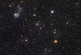 Está en la constelación El Dorado, en las profundidades del cielo austral, y tiene una ubicación privilegiada para ser analizada desde los observatorios de ESO. Es una de las galaxias que forman el Grupo Local que rodea la Vía Láctea, y aunque es enorme en escala humana, es considerada enana ya que posee un décimo de la masa de nuestra galaxia madre y abarca sólo 14.000 años-luz, comparados con los 100.000 años luz de la Vía Láctea. Los astrónomos se refieren a ella como una galaxia enana irregular. Su irregularidad, combinada con su destacada franja de estrellas en su centro, indica a los astrónomos que en las interacciones de mareas con la Vía Láctea y el Grupo Local, la Pequeña Nube Magallanes pudo haberla transformado desde una clásica espiral barrada hasta su forma moderna, más caótica.