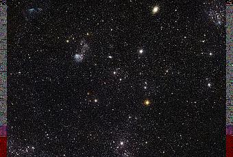 Esta imagen es un mosaico de cuatro fotografías del WFI (Wide Field Imager) instalado en el telescopio MPG/ESO de 2,2 metros en el Observatorio La Silla en Chile. La imagen cubre una zona de cielo equivalente a más de cuatro veces el tamaño de la Luna llena. El enorme campo de visión de esta cámara posibilita ver un amplio rango de objetos de la GNM en una única imagen, a pesar de que sólo puede incluir una pequeña parte de toda la galaxia. En la imagen se aprecian docenas de cúmulos de estrellas jóvenes, así como también rastros de nubes de gas ardiente. Enormes cantidades de estrellas tenues llenan la imagen de lado a lado y, en el fondo, más allá de la GNM, se pueden ver más galaxias.