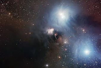 La nebulosa en torno a R Coronae Australis. El área mostrada en la imagen equivale en tamaño a la Luna Llena. Esta estrella (R Coronae Australis) está situada a más de 400 años-luz de distancia de nosotros, en la constelación de la Corona Austral. Se trata de una estrella variable de magnitud 9'7 (no es visible a simple vista), y es muy joven, aún no se ha librado de su embrionaria envoltura de gas y polvo, como podemos ver. Se le estima una masa entre 2 y 10 masas solares, y tiene una luminosidad 40 veces mayor que la del Sol.
