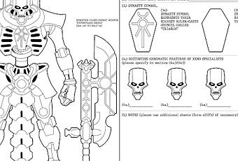 GW saco en 2019 una hoja para probar esquemas de pintura, heráldica y demás en Marines Espaciales Primaris,que cualquier puede descargar libremente (Ver),como antes había para los Marines Espaciales "Normalis" y lo volvió a reflotar con la salida de la caja de Idomitus,que es el pistoletazo de salida de la 9ª ed. Pero no hizo algo similar con la otra facción de la caja, los Necrones. Hasta que tuvo que ir un fan (Kimplates), hacer una y subirla para aquellos que juegan o quieran jugar con Necrones.
