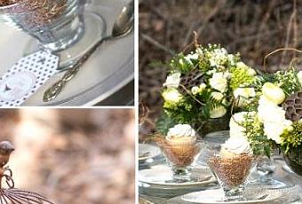 Tonos nude, empolvados, con el bosque como escenario de fondo, donde los elementos rústicos y la madera, en forma de troncos y ramas, juegan un papel protagonista. Han tomado como base de inspiración los pájaros, donde encontramos motivos de ellos en formas de galletas, nidos como soporte o jaulas decoradas con delicados y cuidados arreglos florales.