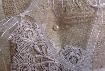Personalizado con las iniciales de ambos y con la fecha del enlace. Una bonita tela brocada en color blanco y sobre ésta lino un poquito rústico.