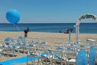 Sin embargo, vayamos por partes. La ceremonia se celebró en la playa: Se escogieron sillas de madera blancas, con una alfombra azul y como obsequio para los invitados se regalaron sombrillas azules de Mi Boda Bonita, que al ser sintéticas, servían tanto para proteger del sol como proteger de la lluvia ante un eventual contratiempo. Daban la bienvenida a los invitados un par de globos gigantes de color azul, hinchados con helio. Los novios se situarían bajo un arco decorado por la Floristería Trévol de Reus, con un banquito blanco a juego. Una idea original para una boda muy bonita al aire libre: una boda íntima, personal y llena de encanto: