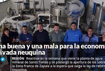 Reactivarán la semana que viene la planta de agua mineral de Santo Tomás y se postergó la apertura de los sobres de la Zona Franca de Zapala a la espera que salga la ley de reforma impostiva.