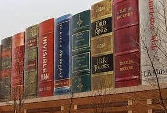 La imagen que hoy nos sirve de referencia, un gigantesco estante de libros, es la fachada de la parte Sur de su Biblioteca, uno de los edificios más curiosos del mundo, donde se muestran 22 títulos que han sido sugeridos por los lectores y seleccionado en último lugar por el Consejo de la propia Biblioteca.